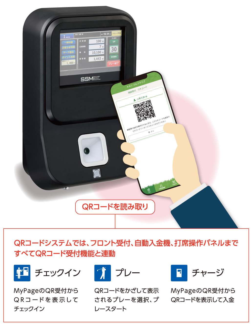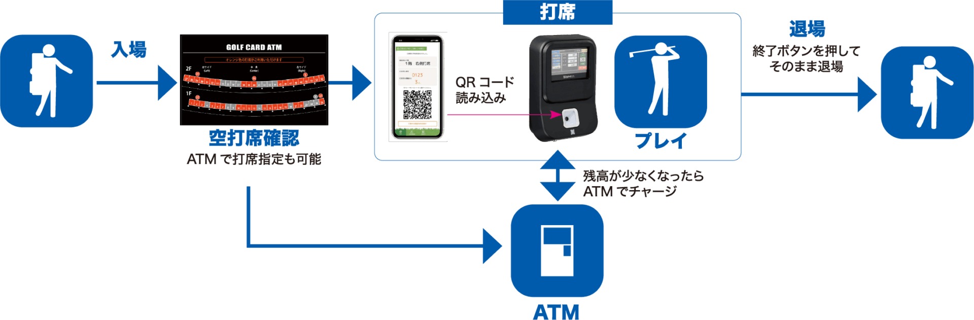 WEBシステム連動でスマートフォンからカードへの入金や打席予約などが可能